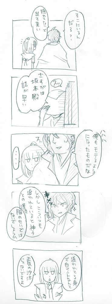同じことが高杉さんのマントにもいえると思うの。黒いから闇夜には紛れるかもしれないけど、狭い路地なんかを走って逃げたりなんかしたら、立て掛けてある柱やら桶やら、その他いろんなものを巻き込んで大騒ぎ。ここにおるでー!って大宣伝しつつ京都を失踪。